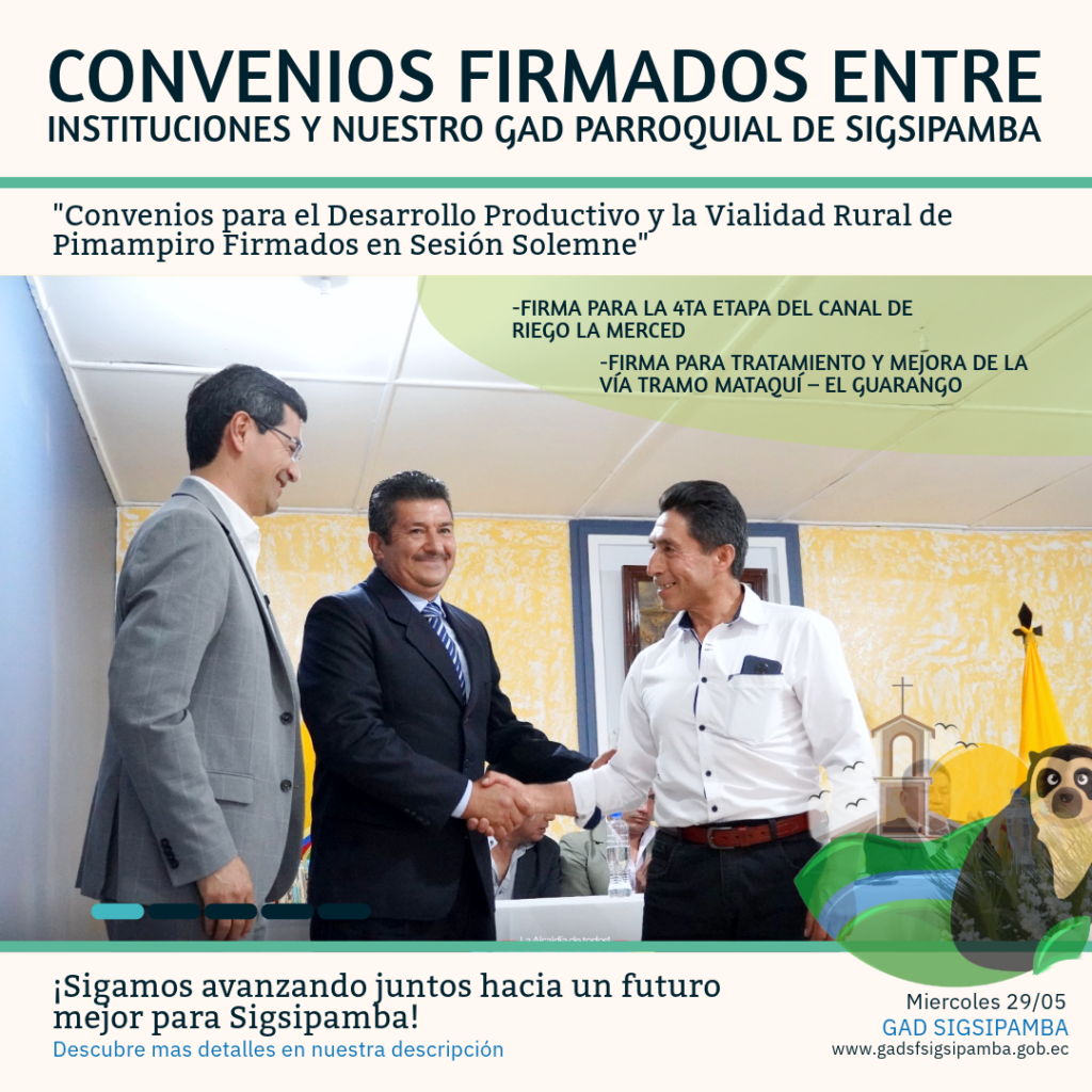 En una significativa sesión solemne, se han firmado dos importantes convenios entre diversas instituciones y nuestro GAD Parroquial Sigsipamba, destinados a impulsar el desarrollo productivo y la vialidad rural de Pimampiro.